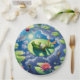 A vivid green frog is comfortably sprawled on a lily pad, soaking in the sun's rays amidst a tranquil pond dotted with pink blooming lotus flowers