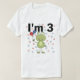An adorable 3rd birthday design on 3rd birthday T-shirts, cards, stickers, magnets, tote bags, and more featuring a green frog with birthday balloons and text that reads "I'm 3".