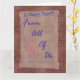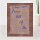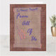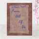 A modern sketch of a parchment scroll bears the words, "From All of Us" in a contemporary, friendly typeface next to a branch with a number of leaves. The top of this over-sized image — which will accommodate signatures and greetings from a large group — can be customized for the recipient by substituting the name displayed for the appropriate one (or, simply delete, as preferred). Inside, in the upper left-hand corner appears, "With all best wishes from:", underlined, which can be edited to taste or deleted. Striking colours of purplish blue and salmon make the design, with its subtle background of dots, suitable for just about anybody and any occasion.