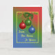 Christmas card with ornaments and holly. From Our House To Yours. Customizable inside message.