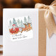 Kids father christmas stickers featuring a minimilist white background, elegant watercolor pine trees, santa claus with his reindeers, snowfall, and a text template for you to personalize.