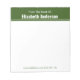 This from the desk of notepad has white display text at the top. The top portion is forest green. There are two lines of white display text in the green area. The top line says 'From The Desk Of'. The second line is for the recipient's name. At the bottom, there's forest green display text for contact information such as an email address and phone number. The text can be edited or deleted as desired.