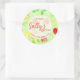 A bright sticker decorated with a variety of fruits and vegetables illustrated with watercolor on a lime green watercolor wash background with text curved around the edges that can be edited with your personal or business information.