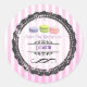 A sweet thank you sticker which says: from the kitchen of. Personalize with a name. 3 cute little watercolor macarons in pink, lime and purple colours. Set on a fancy grunge style circle frame. The background is a pink striped background which has a distressed look to it.