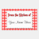 Retro country red and white plaid pattern of checks and stripes on customizable stickers reading From the Kitchen of in retro red and black letters, with script letters for your name on a faux doily. Customize it to change fonts or sizing, add fields or change background colours or label shape, even save your design for later.
