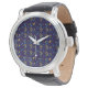 Front and back view of a wristwatch. The watch features a colorful geometric pattern on a blue dial, silver casing, and a black leather strap.