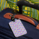 Front of luggage tag with colourful, abstract pattern of dots and circles in pink, blue, and purple. Back shows lines for personal details, strap attached.