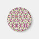 Front view: Round pin with intricate purple and pink floral pattern. Back view: Silver metallic clip. Elegant, vintage design with a decorative vibe.