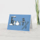 Frosty word art holiday card featuring a snowman, snowflakes, penguin, skis, and a top hat. Inside says "We regret to inform you that due to global warming, this card may be as close as you get to having a snowman in your front yard this holiday season."