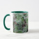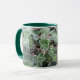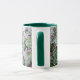 A white mug decorated with frosted ivy, with a dark green rim and handle