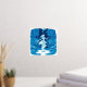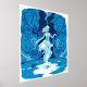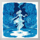 A mesmerizing digital illustration presents an ethereal woman, her translucent form seemingly crafted from ice. She stands poised on a delicate, crystalline platform, surrounded by swirling, abstract blue patterns that evoke the fluidity of water or the mystery of a nebula. The reflective surface below mirrors these celestial hues, creating an aura of otherworldly beauty and serene stillness.