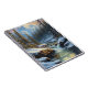 Amidst a winter wonderland, a rushing stream cuts through a snow-covered forest. Majestic frozen mountains stand guard on the horizon, their peaks kissed by snow. A serene scene where the stream's song and nature's hush coalesce, painting a portrait of tranquil beauty.