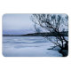 This flexible magnet features an impressionistic depiction of a scenic winter landscape of frozen Cayuga Lake viewed from Stewart Park in Ithaca, NY. It is one of the five Finger Lakes in upstate New York. The frigid icy cold day in February is illustrated by the lovely shades of blue, grey, black and white of the ice and sky. Willow tree branches in silhouette frame the foreground.