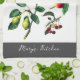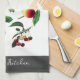Classic style fruit art is ready to personalize with your own text on this  kitchen towel. White on back side.