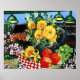 A colourful painting of fruit and flowers on a daystall table in Seattle's Pike Place Market.