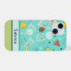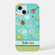 Personnalisez ce coque iphone imprimé d'un motif coloré de style memphis et de fruits abstraits sur le bleu et le vert. Modifiez simplement le texte du nom. Choisissez entre deux styles pour Apple iPhone 15 ou une variété d'autres modèles de téléphone dans le menu déroulant.