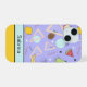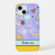 Personalize this iPhone case printed with a colourful abstract fruit and memphis style pattern on pale purple and purple. Just edit the name text. Choose from two styles for Apple iPhone 15 or a variety of other phone models in the drop-down menu.
