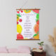 A hanging tapestry featuring a Bible scripture from the book of Galatians 5:22-23 and decorated with watercolor illustrations of a variety of colourful fruits painted with watercolor and accented with spatter spots.