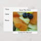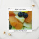 save the date and come for brunch are in large letters with a macro image of fruit salad between the words.