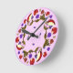 Fruits And Leaves Round Wall Clock by Kristie Hubler, with apples, peaches, berries such as blue raspberries, blueberries, golden raspberries, gooseberries, with undulating leaves