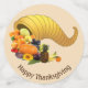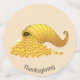 Beautiful horn of plenty with pumpkin, fruits and gold metallic look on beige Table Confetti.