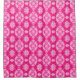 Shower curtain in a tie dye pattern in shades of deep fuchsia pink, orchid, and pastel pink, accented with soft violet