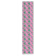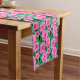 Table runner in a pattern of camellia flowers in shades of deep to pastel fuchsia pink, against a background of dark jade green leaves