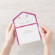 AVAILABLE WITH OR WITHOUT A QR CODE TO SCA IN THE RSVP AREA. This simple yet elegant design has a modern look, with a two-toned fuchsia pink and white background. Add a QR code to your invitation so that gusts can quickly access your wedding Website for details, directions, menu options, and more, or add your gift registry Web URL. Personalized All-In-One invitations are a unique combination of both a beautifully printed custom invitation with an easy to tear off perforated RSVP postcard. And they are so easy to use! You simply fold, then seal the back flap with the three included clear stickers, and mail. And when your guests receive your custom invite, they just tear the perforated RSVP Card off and drop it back in the mail to you! Created by Simply Farmhouse Press.