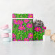 Wrapping paper in a pattern of deep fuchsia pink wildflowers, with yellow centres, in a field of green grass