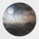 A full moon between dark clouds.