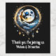 A wonderful and vibrant 3D looking full moon is floating above glowing blue fluffy clouds that have small stars twinkling in them. The moon is framed by a faux gold circle that has celestial signs hanging from it and it is set against a midnight black background that may be changed to any colour of your choice. Editable white templates appear below the graphic. Ideal for a moon and stars wedding; for your special starry night themed anniversary or for any wiccan business; lodge or resort.
