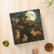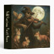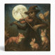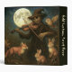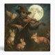 Spooky scene with a full moon shining down on a field of corn, A creepy scarecrow is playing the fiddle while some animals look on, Small creatures and an owl are part of this strange Halloween picture.