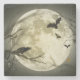 Halloween and gothic themed image. A big full moon at night with bats flying around and a raven sitting on the branch of a craggy tree.