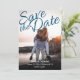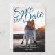 Full photo save the date with script text design on front and three photos on back of card. Colour of back and text can be changed when personalizing to compliment your own engagement photos.