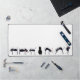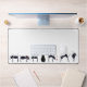 The desk mat is 31 x 15 with a non-slip surface. It features a cartoon-style illustration of a group of silly black cats running across the mat. The cats are all different sizes and shapes, and they are doing all sorts of silly things. The illustrations are black with some red and have playful details. It is sure to bring a smile to your face every time you see it.