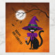 Fun black cat with green eyes wearing a witch hat and a big purple bow and holding a glass of wine or cocktail. Full moon, bats flying and a branch of a tree. Orange, black and purple. Ideal for a Halloween party.