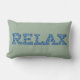 A fun lumbar pillow with the word 'CHILL' in letters filled with a blue and white pattern on a soft green background.