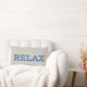 A fun lumbar pillow with the word 'RELAX' in letters filled with a blue and green floral pattern on a hessian-colored (burlap) background.