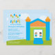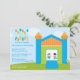 This 5x7 boy's birthday party invite has a blue, green, and orange stripes bouncehouse on the right with your easily customizable party information on the left. There are two boys bouncing inside of the house. Cocoa Studio