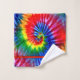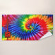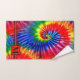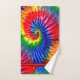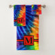 Cette serviette de bain amusante est décorée d'un teint cravate dans les tons arc-en-ciel de rouge, vert, jaune, bleu et orange. Chaque serviette a une barre rouge en bas avec un carré pour votre lettre monogramme. Parfait pour un thème rétro ou hippy.