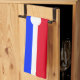 This elegant pretty design features bright red and royal blue design halves, unified with a crisp, slender white centre band that runs horizontally across the length of the design with a centred white circular bump-out.