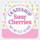 A fun packaging label or sticker in a candy pattern that includes colourful popsicles, ice cream, lollipops and candies in green, orange, blue and pink. Great for party favours with candy or candy shops that need labels for their candy bags, with the candy flavour "Sour Cherries" editable with your own product. Using the Zazzle editor, you can change the pink design strip at the bottom to make it into whatever colour you want, which is great for multiple branding uses.