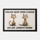 Attention! Cat Escape Artists on Duty. Ever feel like your house is a revolving door for adventurous felines? These two mischief-makers are always on the lookout for an escape route and an open door is their golden ticket! This hilarious doormat featuring our feline escape artists will keep your home secure and your escape artists contained, all while giving your guests a good chuckle. "Please Close Door - Escape Artists on Duty!"