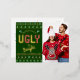 “May all your sweaters be ugly & bright.” Celebrate the holidays in “style” with your ugliest, tackiest Christmas sweaters! On the left side, cute, whimsical trees, reindeer, ornaments, and playful “sweater” typography in real gold foil, brick red, dusty green, rose pink and light blue, overlay a hunter green background. Your custom photo is on the right. A tree and reindeer icon, along with your custom note, are on the back. Celebrate with family and friends while you feel the warmth and joy of the holiday season. Send out this fun, simple, modern, personalized Christmas greeting real gold foil postcard. Make this holiday one to remember!