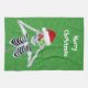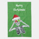 This kitchen hand towel has a fun skeleton holding shiny red and green ornaments up to his eyes wearing a red Santa hat on a green background with gold speckles. Customise the Merry Christmas text with the template.