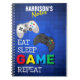 Gamer's love to doodle too! This cool colorful notebook features a blue pixel background, two controllers and the text 'Eat, Sleep, GAME, Repeat', their name and the text notes.