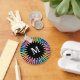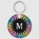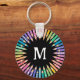 Colourful round keychain for a classroom personalized with the teacher's initial surrounded by coloured pencils in soft rainbow colours. Colourful monogrammed keychain for your art studio personalized with initial in white against a black background with a lot of coloured pencils all pointing toward the centre and sporting rainbow colours.