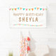 Fun and colourful bunting flags Happy birthday party banner with name. Cute birthday design with party bunting flags in green, red and blue colours and a name - personalize the banner with your name and make your own fun party decor. Change the Happy birthday text if you want. The birthday girl or a boy and the guests will love these cute party banner.