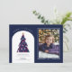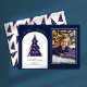 Fun Colourful Chequered Christmas Tree Photo Holiday Card. The Christmas Tree has a warped chequerboard pattern in colours of blue, purple, teal, and pinks. The design features a modern arch with simple and trendy text styles. Personalize the template with your text and details and upload your photo. The back of the card includes a matching scattered tree pattern. © Kimbellished, LLC
