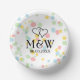 Fun colourful confetti dots paper bowls for wedding. Great for serving cake, desserts, snacks and other food. Disposable party supplies for fancy celebrations. Personalize with name initials and date. Includes interlocking hearts drawing.
